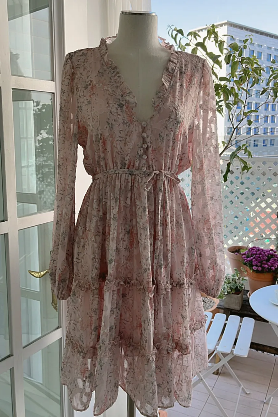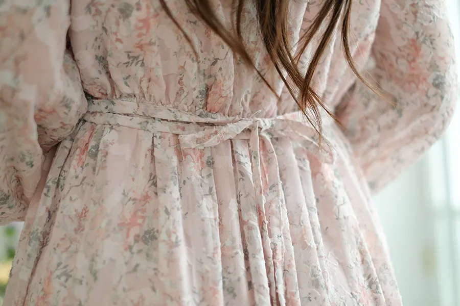紫藤花在飄逸的連衣裙上綻放